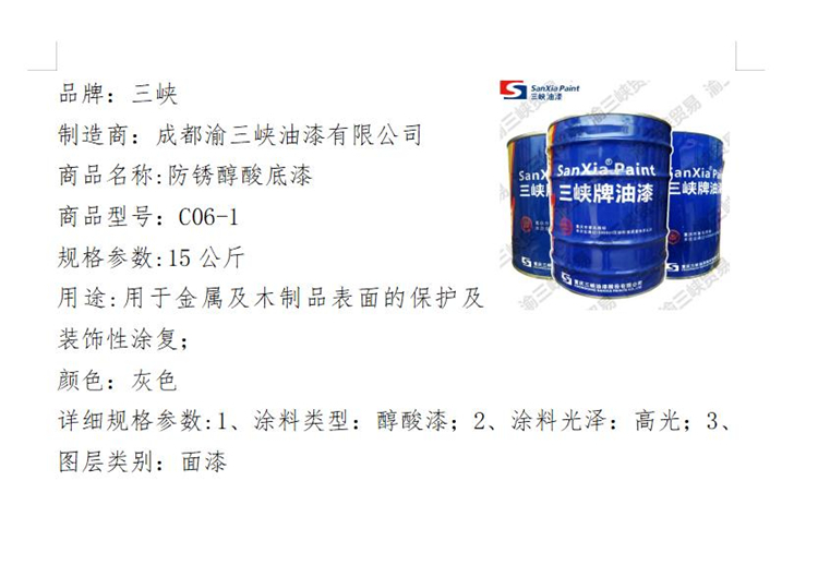 • 商品名称:三峡 C06-1 15公斤 防锈醇酸底漆 灰色(单位:千克)