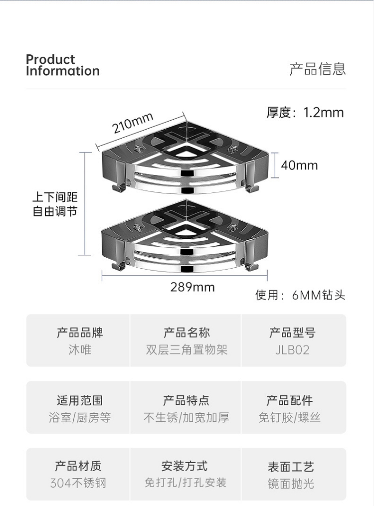 • 商品名称:沐唯 JLB02 304不锈钢双层角篮 转角置物架(单位:个)