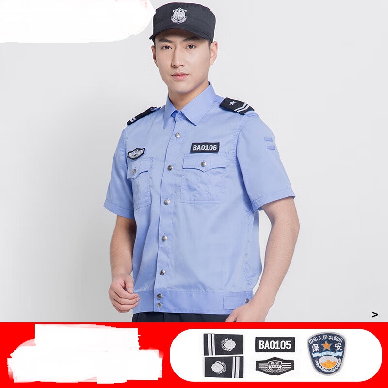 商品名称: 格梦衫 尺码:L/M/XL;类型:短袖套装/配件:帽子+腰带+肩章 保安服 尺码:L/M/XL;类型:短袖套装/配件:帽子+腰带+肩章