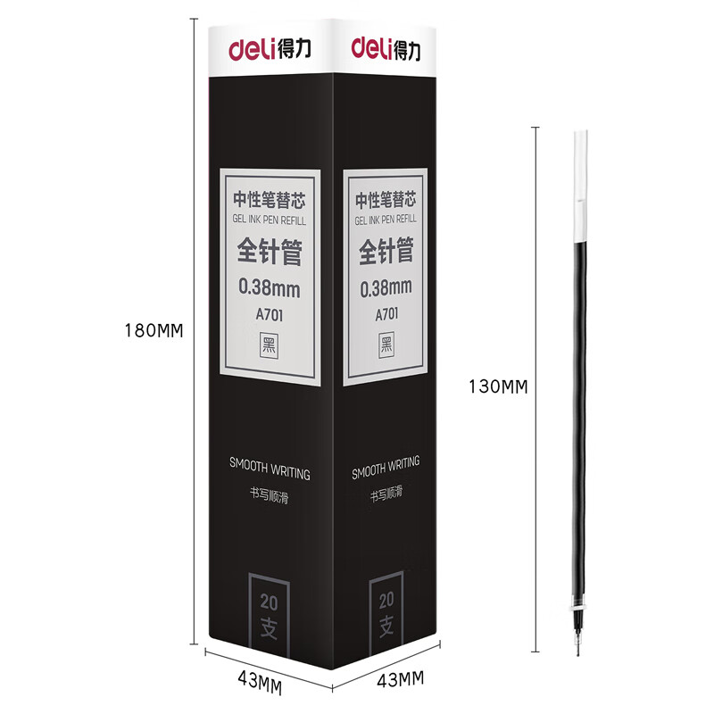• 商品名称:得力/deli A701 0.38mm全针管黑色中性笔笔芯 20支/盒