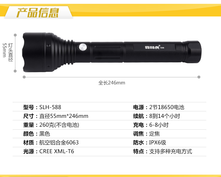 • 商品名称:森林虎 588 55*246mm 强光手电筒 黑色(单位:支)