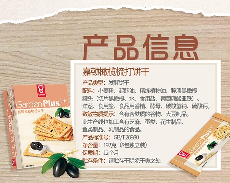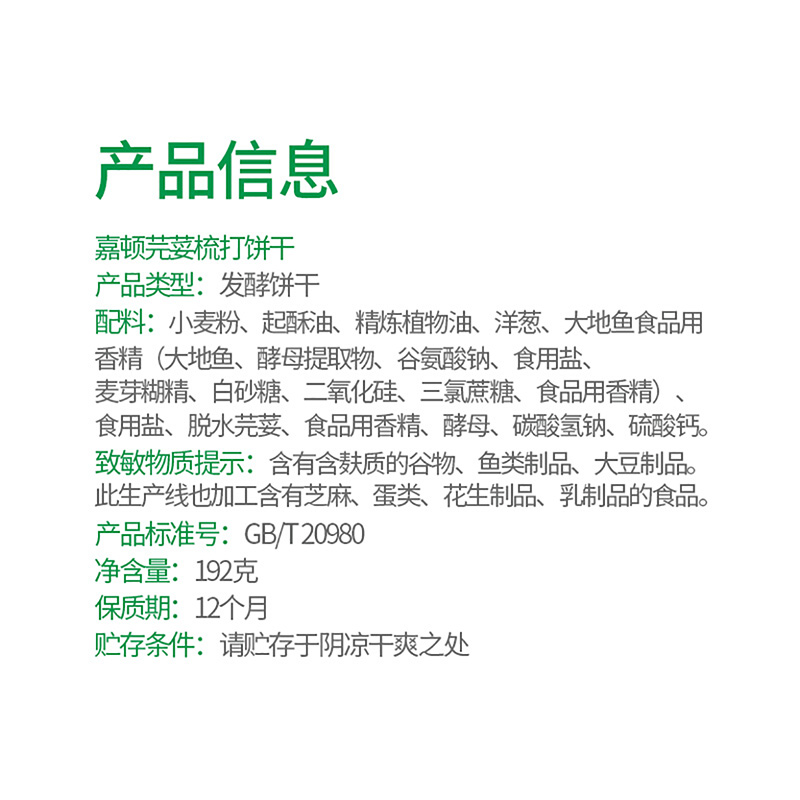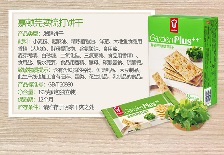 • 商品名称:嘉顿 芫荽梳打饼干 192g 单位:盒