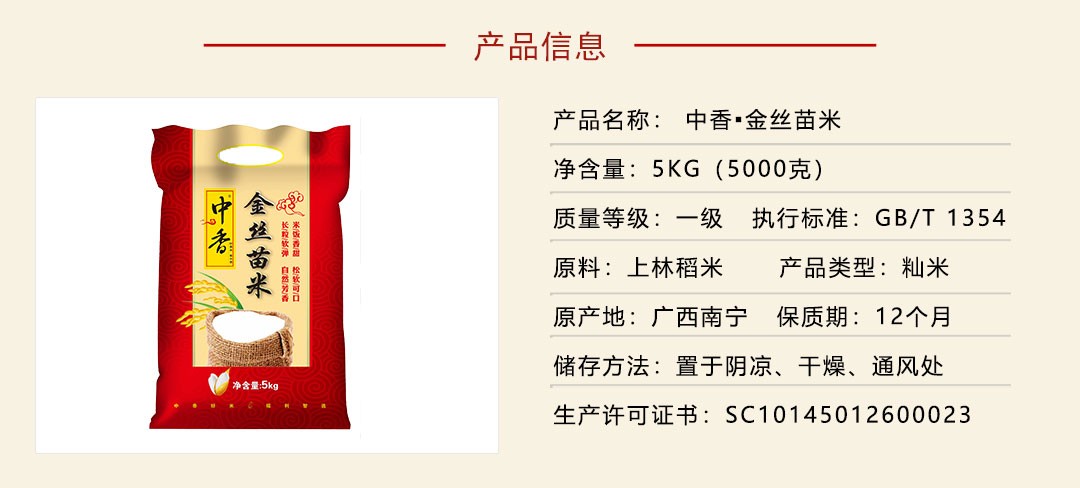 • 商品名称:中香 上林金丝苗米5kg 大米 红色(单位:袋)