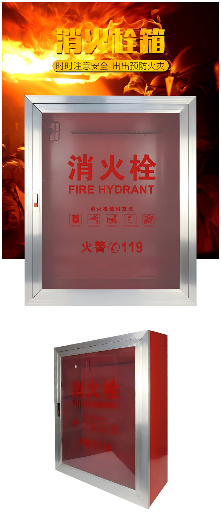 • 商品名称:金工 箱体高:800mm;箱体宽:650mm;箱体长:240mm;板材厚度:1.2mm;安装方式:明装;开门方式:右开 铝合金框镶玻璃消火栓箱