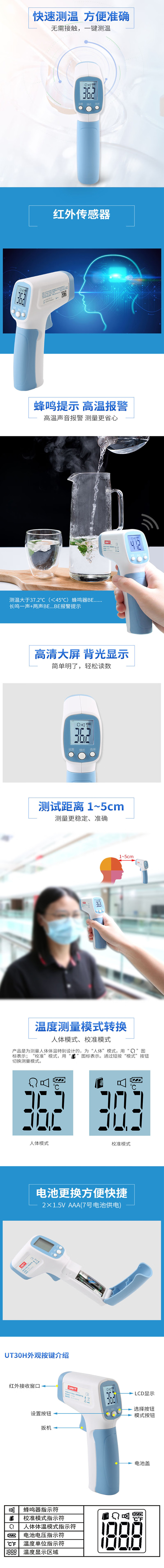 • 商品名称:优利德/UNI-T 32°C~45°C/±0.2°C/UT30H 红外人体测温仪