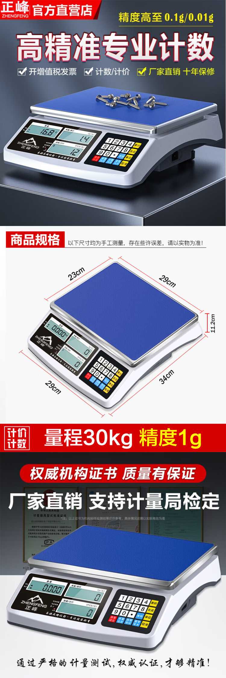 商品名称: 正峰 称量范围:30Kg;精度:0.5g 最小可分辨重量:10g 电子计数秤 称量范围:30Kg;精度:0.5g 最小可分辨重量:10g